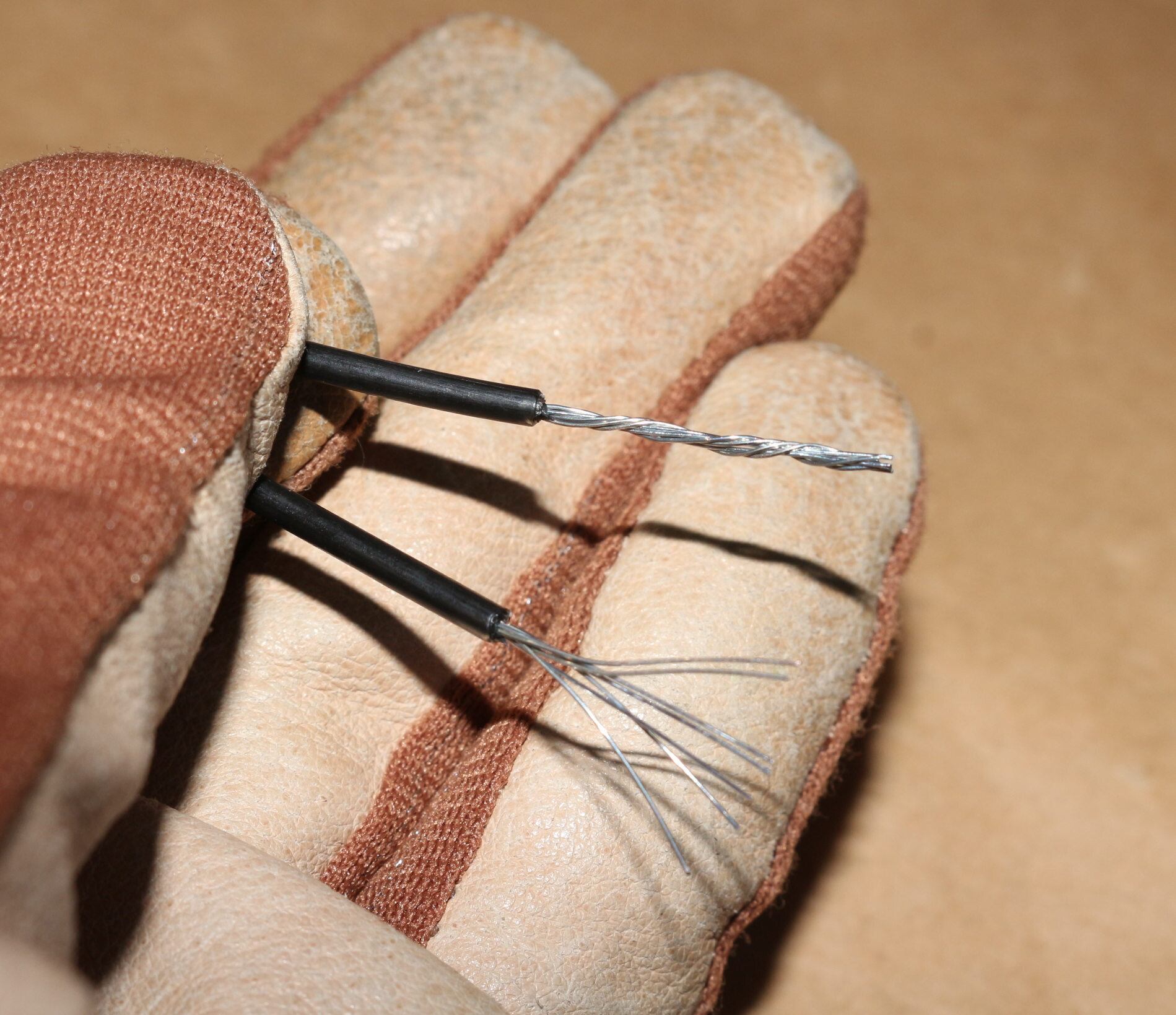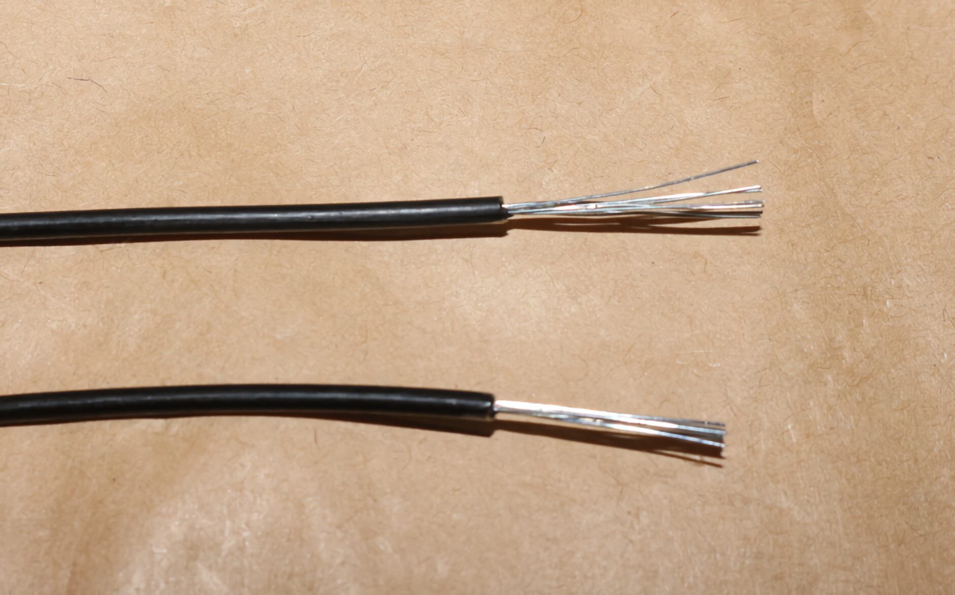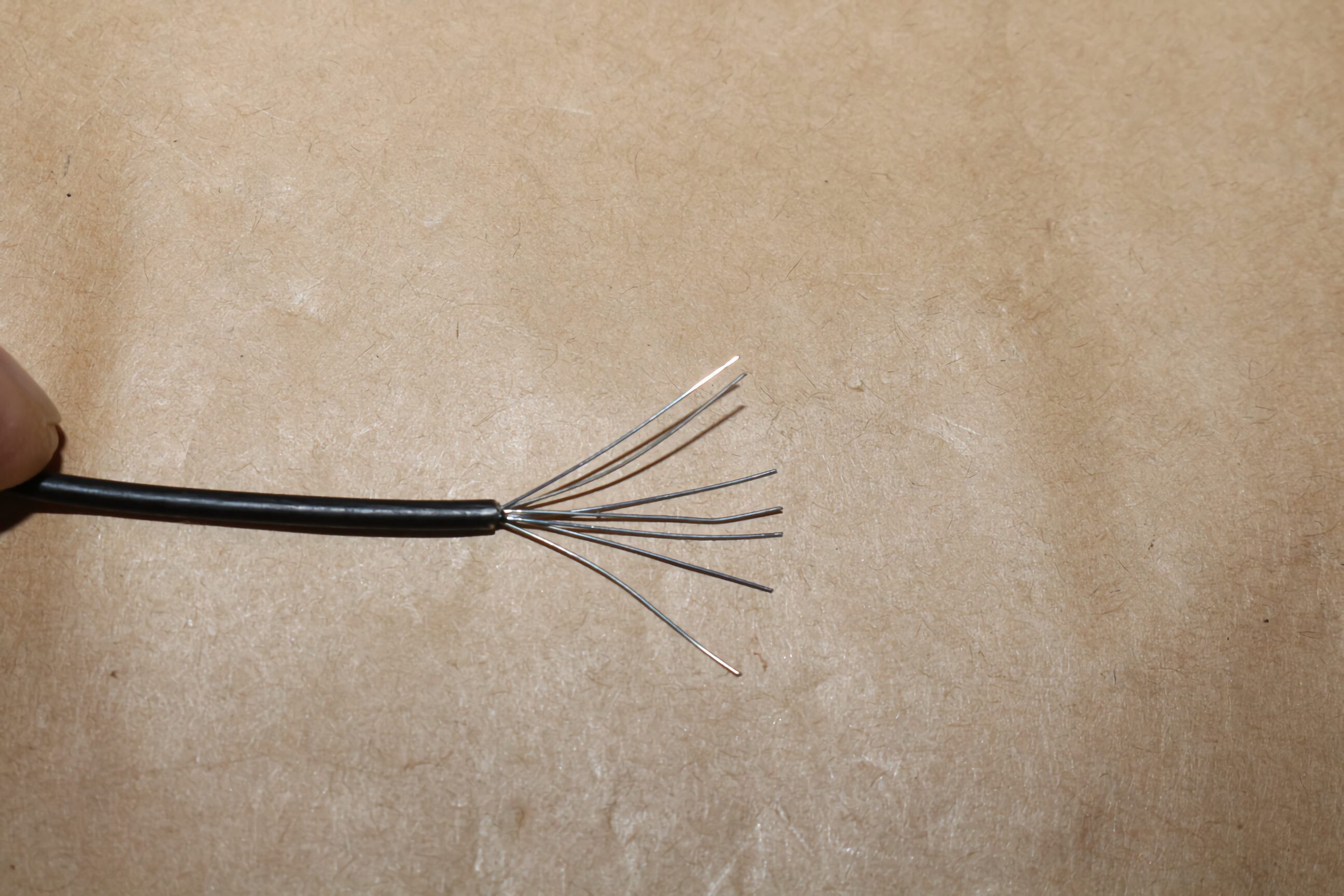被覆は樹脂製で固く芯線は針金ピアノ線感がある固い素材です。